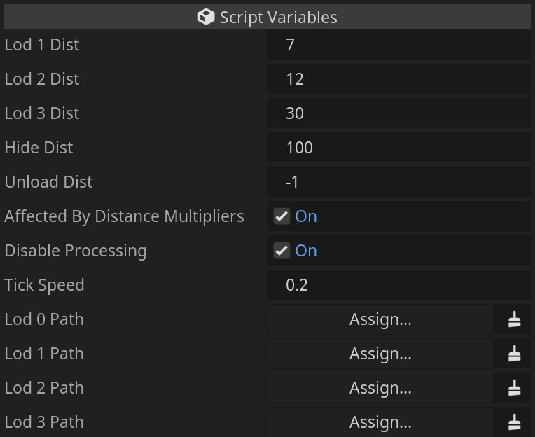 The distance variables represent the lengths after which you’ll switch to LOD1/LOD2/LOD3, hide all objects, or queue_free the whole thing.