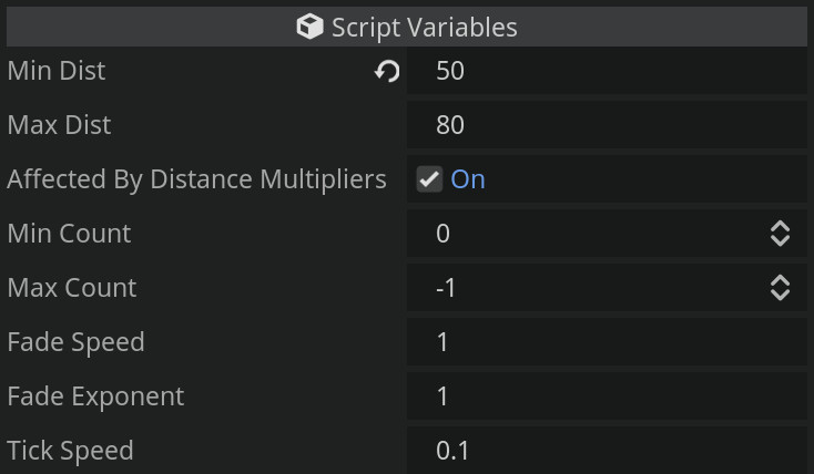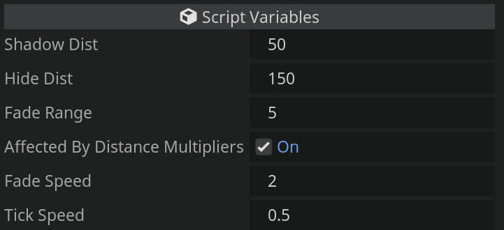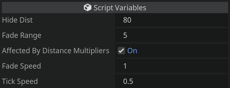 For all of the scripts, we define the distance at which we want to adjust our objects. For most cases, setting the distance to -1 will simply cause that case to be ignored. In addition, as a very basic performance improvement, there is a tick speed (in seconds) that limits how often we check the distance or change object properties.